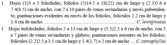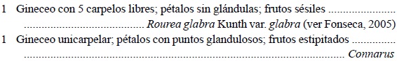 Por ello, a continuación se presenta una clave modificada de Forero (2010) para la distinción entre los géneros Rourea y Connarus y la descripción de este último. Asimismo, se anexan las descripciones concisas de C. lentiginosus Brandegee y C. stenophyllus Standl. et L.O. Williams ex Ant. Molina, de acuerdo con los estándares de Flora de Guerrero y basadas en los ejemplares de tal estado depositados en FCME y MEXU y en Forero (2010); de igual forma, se proporciona una clave para distinguir ambas especies.