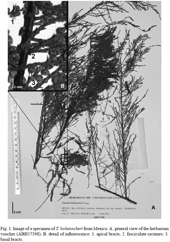 Plant material was collected in Baja California during the spring of 2010, and it is conserved at the herbarium ABH (University of Alicante, Spain). For the species identification and morphological characterization, different monographs of the genus Tamarix were consulted (Baum, 1978; Zohary, 1987; Yang and Gaskin, 2007). In addition, herbarium vouchers from BCMEX, G, K, MA, MO, PRC, PR, VAL and W (Thiers, 2011) were also examined. The abbreviations of author names follow those proposed by Brummitt and Powell (1992), amended by the IPNI (2012). Plant images were taken using Pentax K200D reflex digital camera with Pentax D FA Macro 100mm F2.8 WR.