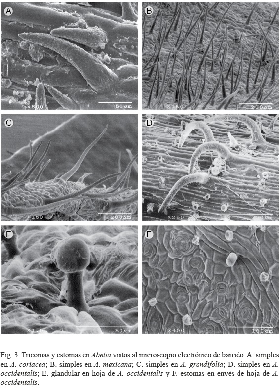 Vestidura: La vestidura o indumento es evidente en los tallos jóvenes, envés de la hoja, corola y fruto. Ésta cambia en las diferentes especies de Abelia, es hispídula en A. coriacea y A. floribunda, con tricomas entre 0.01-0.04 mm de largo. En A. mexicana y A. grandifolia es híspida, con tricomas entre 0.045-0.060 mm de largo, y en A. occidentalis es estrigosa, con tricomas antrorsos en los tallos y ramillas. La vestidura está formada de dos tipos de tricomas, que de acuerdo con la terminología de Roe (1971) corresponden a: 1) Simples, unicelulares, ligeramente cónicos, con tamaños que varían de 0.01 a 0.06 mm de largo; al microscopio electrónico de barrido (MEB) los tricomas simples muestran una superficie granular (Fig. 3); sobresalen los tricomas de A. occidentalis, los cuales son curvados antrorsamente, a diferencia del resto de las especies que son más bien erectos a ligeramente curvados. 2) Glandulares, multicelulares, de unos 0.03 mm largo, con una cabezuela de cuatro células; están presentes en las ramillas y son especialmente abundantes en las hojas y en la cara adaxial de la corola (Figs. 3 y 4).