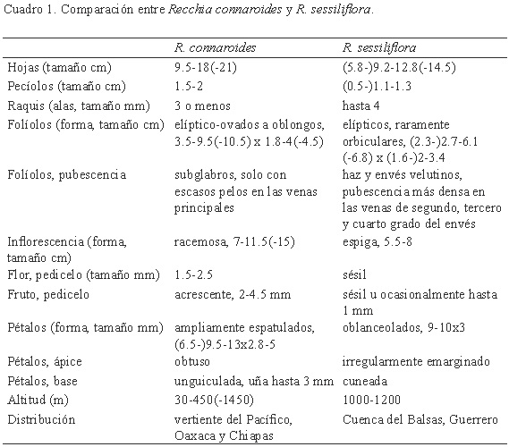 A new species from the Balsas Depression in the state of Guerrero, Mexico, Recchia sessiliflora (Surianaceae Arn.), is described and illustrated. This new species is similar to Recchia connaroides (Loes. & Soler) Standl., differing from the latter in having smaller, elliptic to suborbicular leaflets which increase in size towards the apex of the leaf, a rachis which is clearly winged, a spicate inflorescence and flowers with oblanceolate and irregularly emarginate petals. This species is currently only known from its type locality in tropical dry forest. A comparative table with distinctive characteristics of similar species, a distribution map, and a dichotomous key to distinguish among the known species for the genus Recchia Moc. & Sessé ex DC. are also provided.
