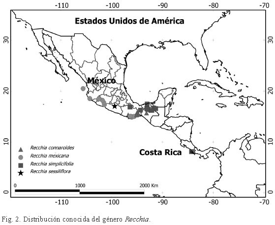 Recchia contaba con tres especies reconocidas y era un género considerado completamente restringido a México (Villaseñor, 2004; Schneider, 2007; Rzedowski y Calderón, 2013), hasta que recientemente una de ellas fue colectada en Centroamérica. La distribución de R. mexicana Moc. & Sessé y R. connaroides (Loes. & Soler) Standl. está restringida al bosque tropical caducifolio de la vertiente del Pacífico, desde Jalisco hasta Oaxaca. En tanto que R. simplicifolia Wendt & Lott se distribuye en el bosque tropical perennifolio, en los estados de Chiapas, Oaxaca, Tabasco y Veracruz (región de Uxpanapa) y recientemente se han colectado algunos especímenes en Puntarenas, Costa Rica (Aguilar y Hammel 610; CR, MO y Herrera 4291; CR, MO; Tropicos.org, 2013) (Fig. 2).