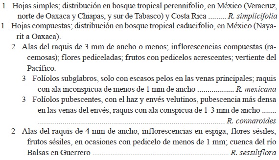 R. connaroidi (Loes. et Soler) Standl. affinis sed folioliis ellipticis vel suborbicularibus, brevioribus, rhachidi alata, inflorescentiis spicatis, floribus sessilibus, petalis oblanceolatis et emarginatis apice.