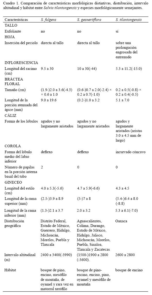 Se describe e ilustra a Salvia tilantongensis como una especie nueva de la Mixteca Alta de Oaxaca, México. El taxon es similar en su morfología a Salvia fulgens y S. gesneriiflora. Se distingue de ambas por su corteza exfoliante, peciolos articulados en un engrosamiento del nudo, hojas más estrechas, brácteas florales de menor tamaño y de ápice más corto, pedicelos más largos durante la fructificación, los lóbulos del cáliz agudos y largamente aristados, lóbulo medio del labio inferior de la corola incurvado cóncavo, filamento y estilo más cortos, y rama inferior del estilo más larga. Además, difiere de S. fulgens por la ausencia de un par de papilas en la porción basal del tubo de la corola. También se provee de descripciones detalladas de S. fulgens y S. gesneriiflora.