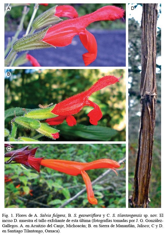 México, con alrededor de 300 especies, es el país que alberga la mayor riqueza de Salvia (Ramamoorthy y Elliott, 1998; Villaseñor, 2004; Martínez-Gordillo et al., 2013). Casi la totalidad de las especies de nuestro país, incluidos los taxones que se describen en este documento, pertenecen al subgénero Calosphace (Benth.) Epling. Sin embargo, también existen representantes de los subgéneros Heterosphace (Salvia henryi A. Gray, S. roemeriana Sheele y S. summa A. Nelson), y Salviastrum (S. texana (Sheele) Torr. y S. whitehousei Alziar), y de la sección Audibertia (S. apiana Jeps., S. brandegeei Munz, S. californica Jeps., S. carduacea Benth., S. clevelandii (A. Gray) Greene, S. columbariae Benth., S. mohavensis Greene, S. munzii Epling, S. pachyphylla Epling ex Munz y S. vaseyi (Porter) Parish) (Epling, 1938; Strachan, 1982; Neisess, 1983; Walker y Elisens, 2001; Martínez-Gordillo et al., 2013). Ramamoorthy y Elliott (1998) reconocieron, con base en referencias bibliográficas y datos inéditos del primer autor, que el estado de Oaxaca contiene la mayor cantidad de especies al poseer una cifra de 63. En esa misma publicación señalaron 35 especies para Chiapas y 48 para Michoacán. Sin embargo, revisiones puntuales recientes para estas dos últimas entidades revelan una cantidad mayor para cada una de ellas, 84 para Oaxaca (García-Mendoza y Meave, 2011), 75 para Chiapas (Domínguez-Vázquez et al., 2002) y 73 (Rodríguez-Jiménez y Espinosa-Garduño, 1996) o 64 (Cornejo-Tenorio e Ibarra-Manríquez, 2011) para Michoacán. El incremento en el número de especies es contundente, lo que señala que persiste un conocimiento insuficiente del género en el país. Es de esperar que el desarrollo de investigaciones y exploración botánica resulten en el descubrimiento de taxones en lugares donde no hayan sido registrados antes, y de algunos aún no descritos. En este sentido, aquí se presenta y describe una de estas nuevas adiciones: Salvia tilantongensis, especie que es semejante en su morfología a Salvia fulgens Cav. y S. gesneriiflora Lindl. & Paxton; éstas son a la vez parecidas entre sí y confundidas con frecuencia, por lo que en este documento se ofrece primero una descripción detallada de ellas, para luego contrastarlas con S. tilantongensis.