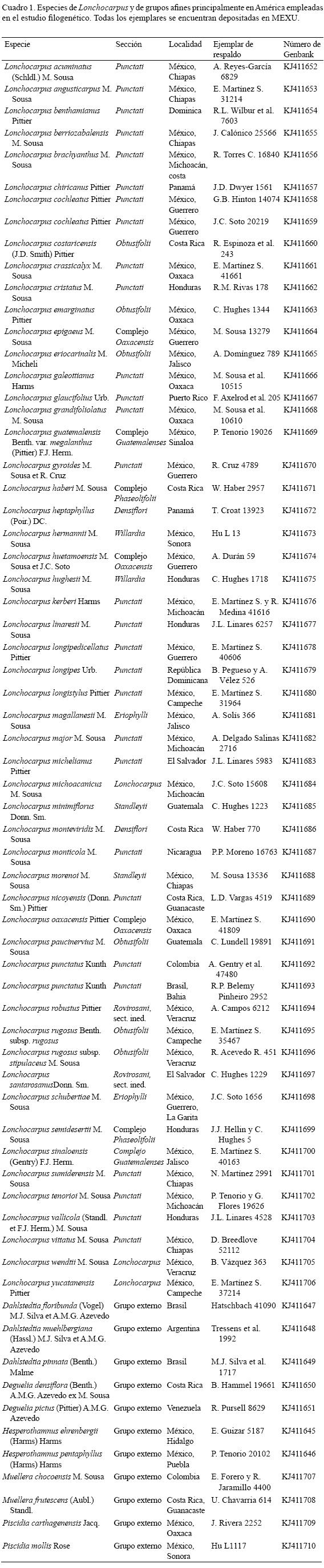 Para la realización del análisis de secuencias de ADN se emplearon 63 muestras que representan 25 especies (de las 29 conocidas) de la sección Punctati, así como al menos dos componentes de cada uno de los demás grupos del género Lonchocarpus, depositadas en su mayoría en el herbario MEXU, siguiendo las definiciones de Sousa. Además, para fines comparativos se incluyeron materiales de los siguientes géneros americanos de Leguminosae-Papilionoideae: Dahlstedtia, Deguelia, Hesperothamnus, Muellera y Piscidia (Cuadro 1).