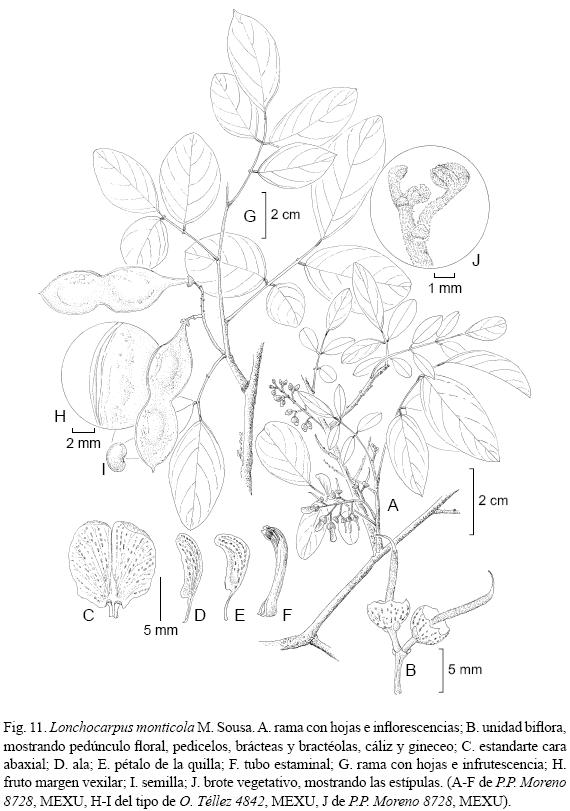 Comentarios taxonómicos. Cuando se describió a Lonchocarpus monticola M. Sousa (Sousa, "1986", 1987), se incluyó la población del Cañón del Sumidero, Chiapas, México (aquí descrita como L. sumiderensis M. Sousa) como coespecífica de la de Nicaragua, pero se desconocían sus frutos. De hecho L. monticola se correlaciona más apropiadamente con L. michelianus Pittier, con la cual comparte la disposición de las bractéolas en el ápice del pedicelo y base del cáliz.