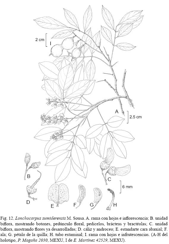 Lonchocarpus sumiderensis M. Sousa, sp. nov. Tipo. México, Chiapas, arriba del Cañón del Sumidero, al final del camino que va al mirador que está en la parte más alta del cañón, 9 Jul 1988 (fl.), M.A. Magaña 2030 (holotipo: MEXU!; isotipos: MEXU!, UJAT!). Fig. 12.