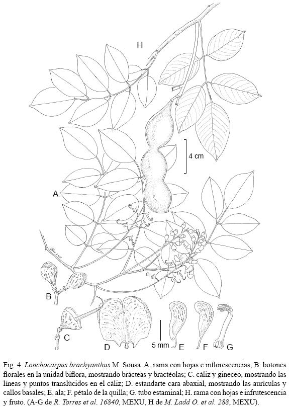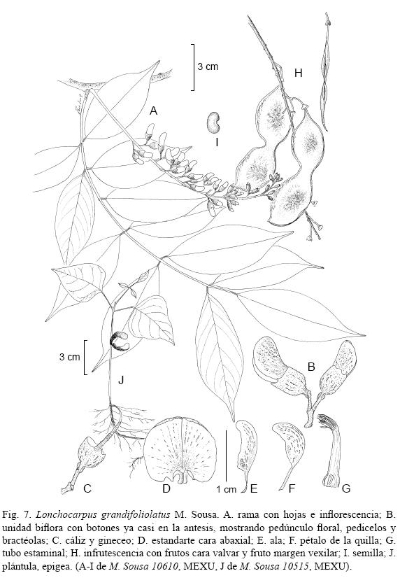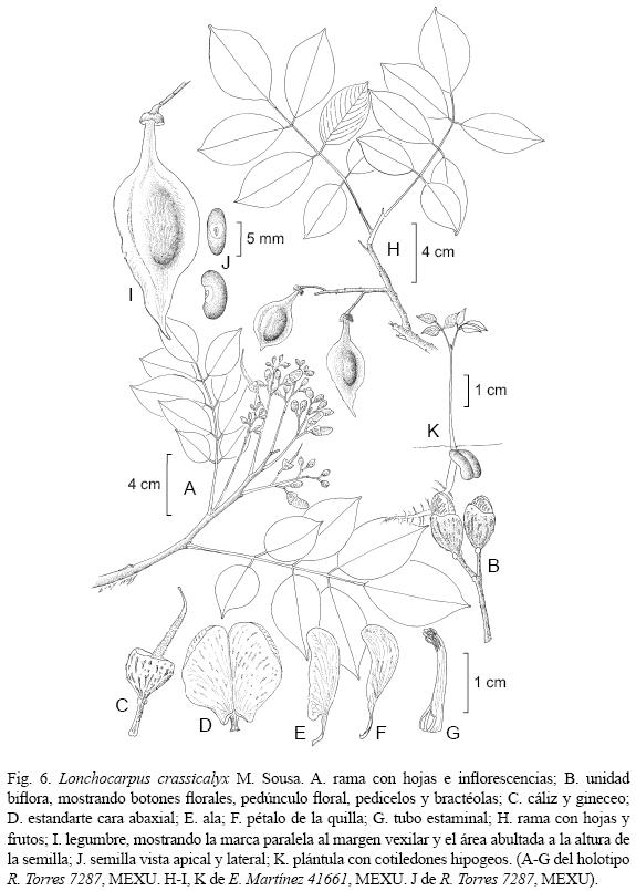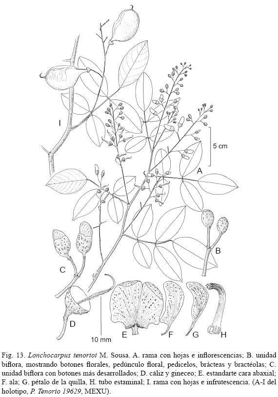 Lonchocarpus tenorioi M. Sousa, sp. nov. Tipo: México, Michoacán, municipio Aquila, 6 km al SE de Cachán, o a 21 km antes de llegar a Tizupa, carretera 200 Tecomán - Playa Azul, 18°14' N, 103°13' O, 150 m, 20 Nov 1997 (fl. y fr.), P. Tenorio L. 19628 y G. Flores F. (holotipo: MEXU!; isotipo: MEXU!). Fig. 13.