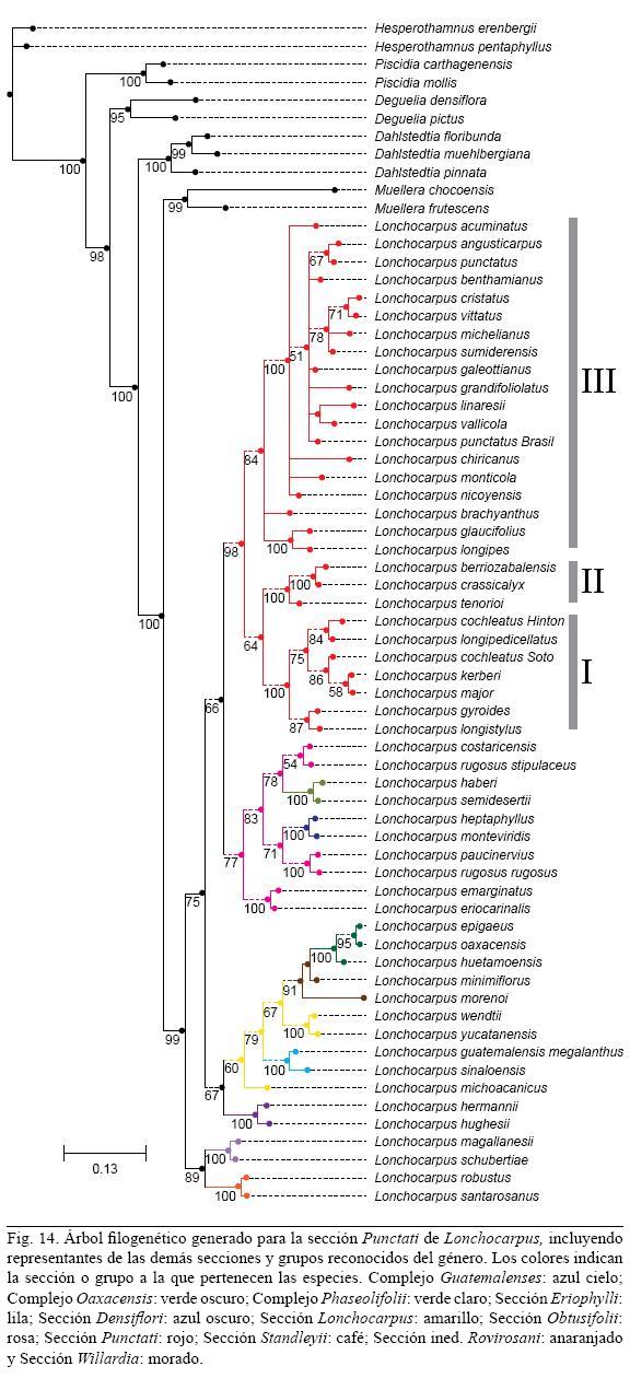 Dentro de la sección Punctati (Fig. 14) quedan definidos tres clados mayores. El clado I, con probabilidad posterior de 100 está conformado por Lonchocarpus cochleatus, L. kerberi, L. major, L. longipedicellatus, L. gyroides y L. longistylus. En varias de las especies de este clado (L. cochleatus, L. major, L. longipedicellatus), básicamente mexicanas, se ha encontrado que las plántulas son hipógeas y los eófilos son opuestos y 3-foliolados. El clado II con 100 de probabilidad posterior queda formado por las especies L. berriozabalensis, L. crassicalyx y L. tenorioi. Finalmente el clado III, con una probabilidad posterior de 84, se subdivide en dos conjuntos el primero contiene al mayor número de componentes incluyendo a L. acuminatus, L. angusticarpus, L. punctatus, L. galeottianus, L. grandifoliolatus, L. benthamianus, L. chiricanus, L. cristatus, L. michelianus, L. sumiderensis, L. vittatus, L. linaresii, L. monticola, L. nicoyensis y L. vallicola (100 probabilidad posterior). Las especies que forman este clado poseen generalmente plántulas con eófilos una vez foliolados y cotiledones epigeos a excepción de L. acuminatus cuyos cotiledones son hipógeos, y de L. chiricanus y L. cristatus que posiblemente tengan las plántulas hipógeas, con los eófilos opuestos 3-foliolados. El segundo grupo dentro del clado III comprende tres especies todas con semillas cubiertas por resina del endocarpo que les da un color castaño oscuro brillante. Así L. brachyanthus queda ubicado hacia la base con una politomía, a su vez L. glaucifolius (100) y L. longipes se definen como especies hermanas.