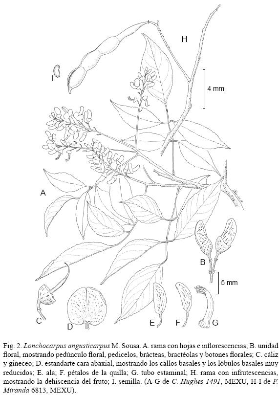 Lonchocarpus angusticarpus M. Sousa. Novon 19: 241. 2009. Tipo: México, Chiapas, La Chacona, 16°47'25" N, 93°10'44" O, 529 m, 10 Ago 1998 (fl.), E. Martínez S., C.H. Ramos, J. Linares y M. Goretti C. 31214 (holotipo: MEXU!; isotipos: A, BM, K, MEXU, MO, NY, US). Fig. 2.