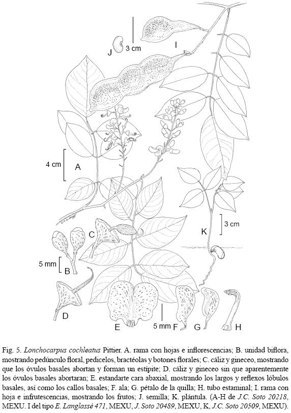 1. En Lonchocarpus michelianus Pittier y L. monticola M. Sousa, las bractéolas están en la base del cáliz o ápice de los pedicelos como también ocurre en las secciones Standleyi y Lonchocarpus.