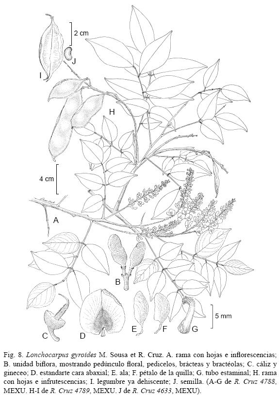 Lonchocarpus gyroides M. Sousa et R. Cruz, sp. nov. Tipo: México, Guerrero, a 1 km al NE de Tecomazuchil, municipio General Heliodoro Castillo, 17°37'37" N, 100°1'59" O, 9 Jul 2000 (fl.), R. Cruz Durán 4788, J. Castrejón Reyna y M. García Granados (holotipo: MEXU!; isotipos: FCME!, MEXU!). Fig. 8.