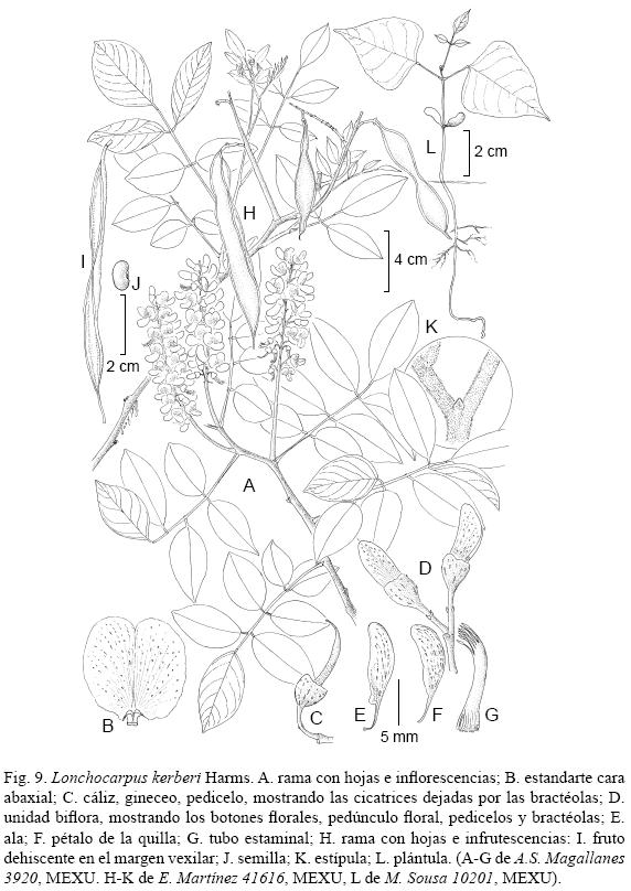 Lonchocarpus kerberi Harms, Feddes Repert. Spec. Nov. Regni Veg. 17: 323.1921. Tipo: México, Colima, Colima Vulkan, Sep 1879 (fl.). E. Kerber 35 (holotipo: B, destruido; isotipo: F! (fragmento)) Fig. 9.