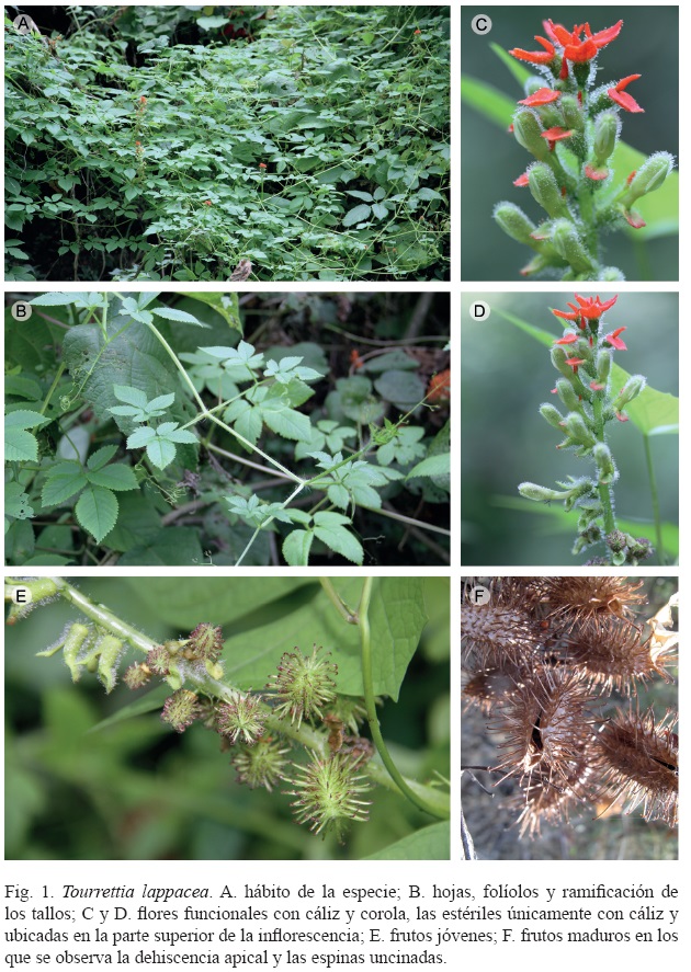El occidente de México, como lo define McVaugh (1961), comprende los estados de Jalisco, Colima, Aguascalientes y parte de los de Nayarit, Durango, Zacatecas, Guanajuato y Michoacán. Se puede considerar esta región como una de las áreas florísticamente mejor estudiadas de la República Mexicana, ya que numerosas familias han sido tratadas en la Flora Novo-Galiciana (e.g. McVaugh, 1984, 2001) y la Flora de Jalisco (e.g. Cervantes, 1992; Carvajal y Acosta, 2010). Además, recientemente se ha publicado un catálogo de las plantas vasculares de Jalisco (Ramírez-Delgadillo et al., 2010). A pesar de lo anterior, ciertas zonas siguen siendo poco exploradas y conforme se intensifican las excursiones botánicas se encuentran nuevas especies y registros, con una marcada tendencia a que éstos provengan de especies con afinidad neotropical, conocidas del sur de México y de Centroamérica (Cuevas-Guzmán et al., 2008; Cuevas-Guzmán y Montero, 2011; Carrillo-Reyes et al., 2013). Recientemente, durante la realización de un inventario florístico en la zona de Villas de Cacoma, en el municipio de Villa Purificación en el estado de Jalisco, se encontró una planta que fue identificada como Tourrettia lappacea (L'Hér.) Willd. ex. L. f. Esta especie pertenece a la familia Bignoniaceae y es una hierba anual con frutos con espinas ganchudas, por lo cual a primera vista se podría confundir con una representante de Cucurbitaceae.
