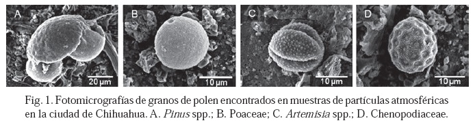 Como objetivo particular se pretendió elaborar una guía de los granos de polen más representativos de la vegetación de la ciudad de Chihuahua, por lo que se incluyeron plantas tanto de ornato como silvestres. Tal guía también puede ser de utilidad en la identificación de polen proveniente de muestras ambientales, como los encontrados por Rodríguez-Villa (2009) en muestras de partículas suspendidas totales de la ciudad de Chihuahua (Fig. 1).
