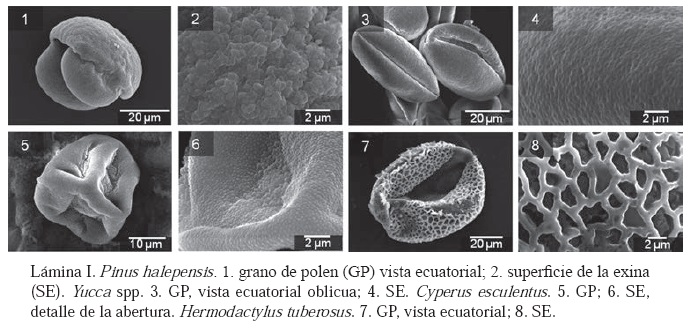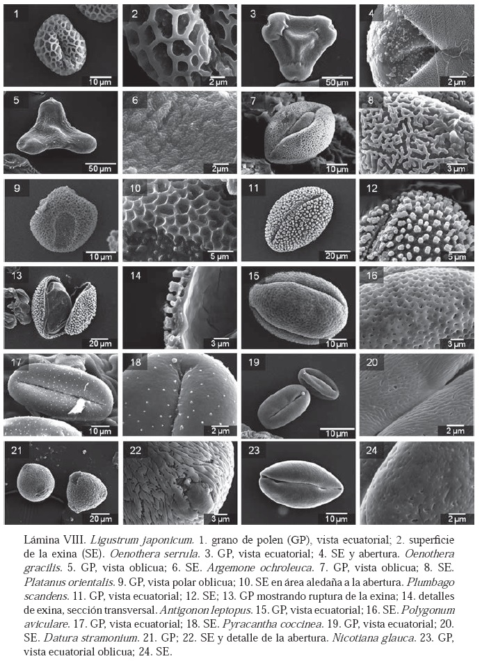 La terminología utilizada en la descripción del polen se basó en Halbriter et al. (2007) y Punt et al. (2007), tomando en consideración la forma, tipo de abertura y patrón de ornamentación de la exina. Algunas descripciones se apoyaron en la base de datos palinológica Pal-Dat (Buchner y Weber, 2012) cuando estuvieron disponibles. Se consideraron cuatro tamaños: pequeño (11-25 μm), mediano (26-50 μm), grande (51-100 μm) y muy grande (>100 μm), de acuerdo con Erdtman (1952).