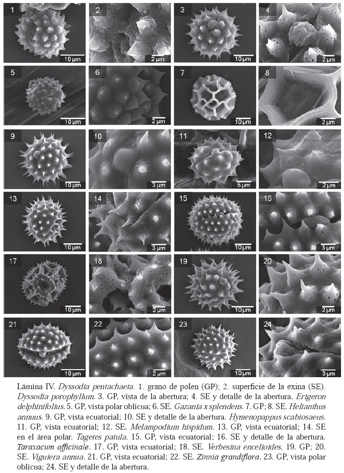 Ornamentación. Los tipos de ornamentación observados fueron: baculado, clavado, equinado, microequinado, fosulado, lofado, microgemado, granulado, perforado, psilado, reticulado, microreticulado, retículo-cristado, rugulado, estriado y verrugado. Los más comunes fueron el equinado (21 especies, 23%), en la familia Asteraceae (excepto en Gazania x splendens), y el reticulado, en 20 especies (22%).