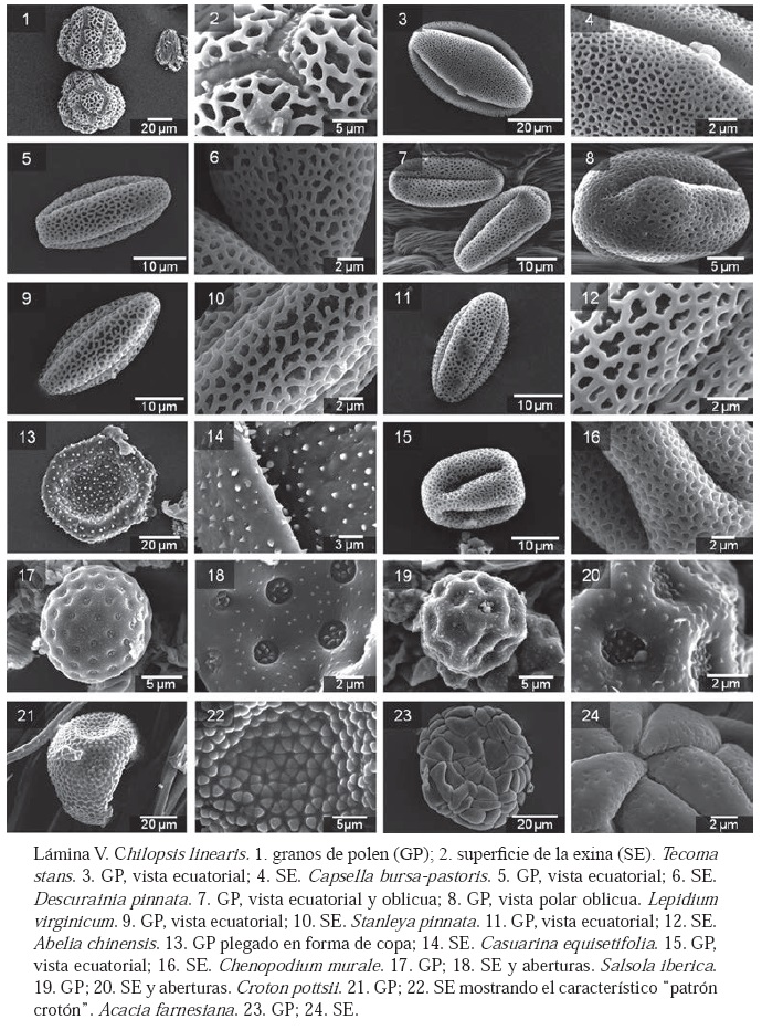 El objetivo de este trabajo fue presentar el primer estudio palinológico de la ciudad de Chihuahua, México, resultando en el desarrollo de un documento gráfico del polen de las gimnospermas y angiospermas de la zona. Se incluyeron muestras tanto de plantas de ornato como silvestres, las cuales fueron colectadas en aceras, parques, áreas públicas y suburbios del área de estudio. El trabajo incluyó 91 especies: 15 árboles, 10 arbustos y 66 herbáceas correspondientes a 37 familias y 86 géneros. Los granos de polen fueron obtenidos directamente de los estambres y observados al microscopio electrónico de barrido sin acetolizar, hidratar o deshidratar. La mayoría de los granos de polen (60%) estuvieron en el rango de tamaño medio. Los patrones de ornamentación más comunes fueron el equinado (23%) y el reticulado (22%). Un gran porcentaje mostró aberturas elongadas: tricolporadas (41%) y tricolpadas (13%), las cuales coinciden con el patrón de plegamiento con aberturas hundidas. Los granos de polen de la mayoría de las especies estudiadas presentan forma esferoidal en su estado hidratado (83%), mientras que la más común entre los granos deshidratados es la prolata (51%). Se observaron tres principales tipos polínicos; el primero corresponde a la familia Asteraceae, el segundo a Poaceae, mientras que el tercero incluye a 10 familias y 15 especies cuyos granos de polen presentan ornamentación reticulada, aberturas elongadas, forma prolata en su estado seco y aberturas hundidas. Se reconoce la necesidad de incluir a futuro más especies presentes en el área.