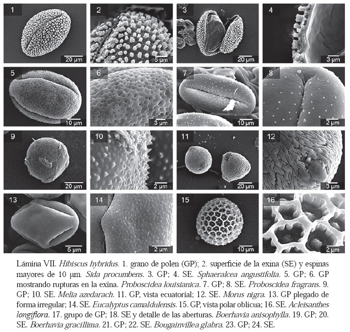 Forma. Los granos de polen de la mayoría de las especies son esferoidales (83%) en su estado hidratado. Otras formas encontradas fueron la prolata (9%), irregular (4%), oblata (3%) y poligonal (1°%).