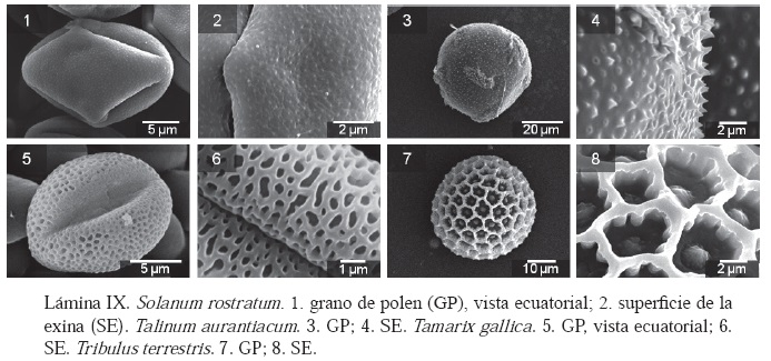 Para preparar los especímenes para su observación en el microscopio electrónico de barrido (MEB), los granos de polen fueron obtenidos de los estambres y montados directamente (sin acetolizar, hidratar o deshidratar) en portamuestras de aluminio con cinta conductiva de cobre y recubiertos con oro por la técnica de erosión catódica. Para examinar la morfología de los granos de polen se utilizó un MEB Jeol JSM-5800LV. Las fotomicrografías fueron obtenidas mediante electrones secundarios y un voltaje de aceleración de 10kV.
