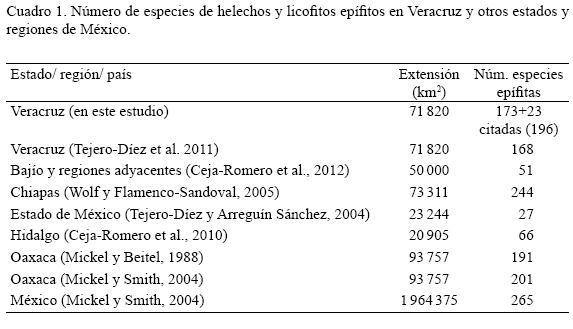 La comparación de nuestros resultados con los obtenidos en trabajos que cuentan con información a nivel estatal o regional sobre el tema (Cuadro 1) pone de manifiesto la importancia del estado de Veracruz en lo que se refiere a riqueza de especies de pteridofitas y licofitas epífitas, al contar en su territorio con entre 173 y 196 taxa (esta última cifra si se consideran los citados en la literatura), quedando solo por debajo de Chiapas y Oaxaca, que cuentan con 244 y 201 especies con esta forma de vida respectivamente (Wolf y Flamenco-Sandoval, 2003; Mickel y Smith, 2004). También resulta evidente que a medida que se tiene un mejor conocimiento florístico de las diferentes regiones de la entidad, se incrementa de manera gradual el número de taxa epífitos reportados en el estado (Cuadro 2).