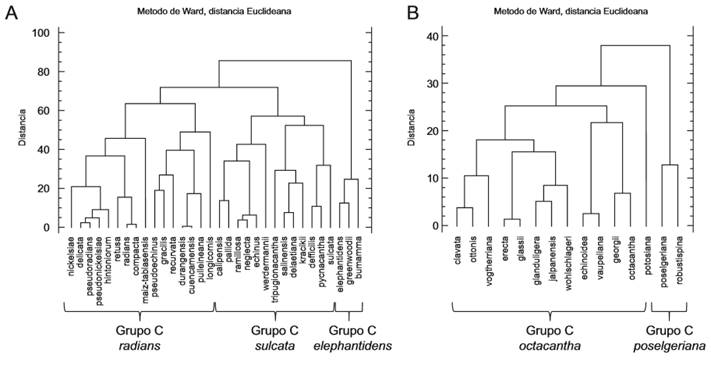 El análisis de conglomerados (AC) ejecutado con 17 variables cuantitativas para las especies sin glándulas extraflorales (subgrupo IA) generó tres grupos, de los cuales el representado por Coryphantha radians está integrado por 16 especies, el grupo C. sulcata por 13 y el grupo C. elephantidens por solo tres (Fig. 4A). El ACP para el grupo sin glándulas generó cinco componentes principales con eigenvalores iguales o mayores a 1.0, los cuales en total sumaron 80.55% de la variación. El componente uno aportó 33.19% de la variación y separa al grupo C. elephantidens por el ancho del tubérculo (0.4035), el largo de la areola (0.3522) y la longitud del surco (0.3513). Los grupos C. radians y C. sulcata se distinguen parcialmente por el componente dos que explica 18.36% de la variación. Los caracteres de mayor peso en este componente fueron el grosor de las espinas centrales (0.5033), el número de espinas centrales (0.4730) y la longitud de las espinas centrales (0.4464). En el AD del grupo C. radians, las primeras tres funciones discriminantes aportan 35.00, 21.22 y 12.97% de la variación respectivamente y explican 69.19% de la variación total. Las correlaciones entre las variables discriminantes y los coeficientes de las funciones lineales discriminantes son mostradas en el Cuadro 2. En la primera función los pesos discriminantes mayores corresponden al largo del fruto que muestra una correlación negativa, la altura del tallo y el número de espinas centrales ambos caracteres con una correlación positiva. La segunda está positivamente correlacionada con el número de espinas radiales y el largo de la areola y tiene una correlación negativa con el largo del tubérculo. La tercera está correlacionada positivamente con el largo del fruto, grosor de las espinas centrales y número de espinas radiales (Cuadro 2).