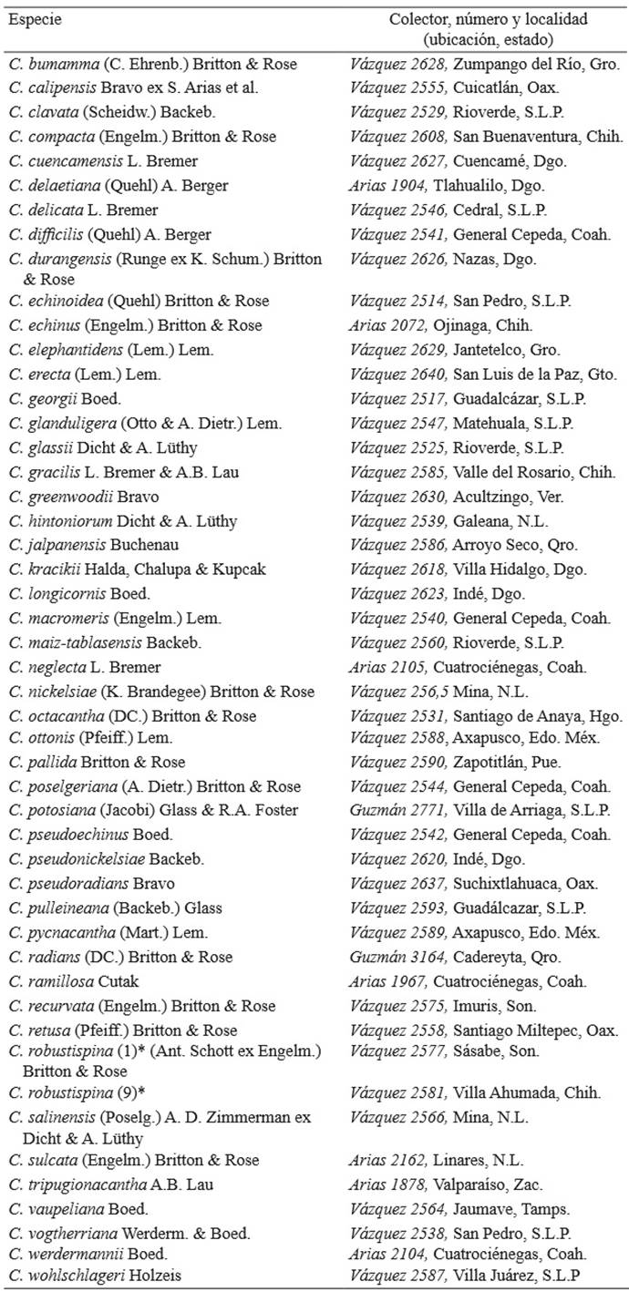 Se examinaron 1373 registros en los herbarios ARIZ, ENCB, FESI, FEZA, Hinton, IEB, KEW, MEXU, MO, TEX/LL, UMO, US, USON y XAL. En los herbarios estadounidenses y el británico se recabaron los datos a través del Sistema Nacional de Información sobre Biodiversidad de México (SNIB) de CONABIO. Los datos obtenidos fueron considerados para las evaluaciones cualitativas cuando se reunió la condición reproductiva y para generar el patrón de distribución del género. De la información geográfica contenida en los herbarios, de la literatura taxonómica (Bravo-Hollis y Sánchez-Mejorada, 1991; Dicht y Lüthy, 2005a; Arias et al., 2012,) y de la experiencia de los autores en colectas previas, se seleccionaron 49 localidades en México donde se distribuye el género (Apéndice).