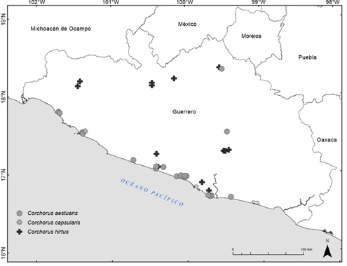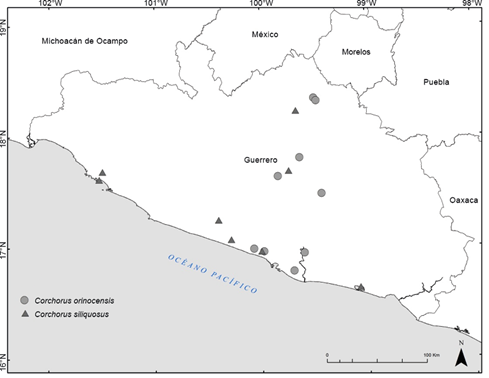Por último, en la lista de especies nativas de México, Villaseñor (2016) registró para el estado nueve especies de Heliocarpus, pero cuatro de ellas en realidad no tienen distribución en la entidad (H. americanus L., H. appendiculatus Turcz., H. donnellsmithii Rose y H. mexicanus (Turcz.) Sprague), pues su distribución en el país corresponde a la zona sureste (Campeche, Chiapas, Oaxaca, Quintana Roo, Tabasco y Yucatán), a la región del centro (Hidalgo, Puebla y San Luis Potosí) y a la del Golfo (Veracruz) respectivamente. Por otro lado, la quinta especie, H. velutinus Rose, es tratada en este trabajo como sinónimo de H. pallidus, y finalmente las cuatro restantes registradas acertadamente para el estado son: H. pallidus, H. parvimontis, H. terebinthinaceus denominado por él -terebinthaceus-, y H. velutinus). El mismo autor reporta tres especies de Trichospermum en la región de estudio; sin embargo, T. galeottii (Turcz.) Sprague corresponde a un sinónimo de T. mexicanum y la distribución de T. lassetianum (Hochr.) Dorr es restringida al sureste mexicano (Chiapas, Oaxaca, Quintana Roo y Tabasco) (Dorr, 2011). Otra especie también registrada en la entidad pero del género Triumfetta por Villaseñor (2016), es T. discolor Rose; no obstante su distribución corresponde a la Vertiente del Pacífico (Durango, Nayarit, Oaxaca, Sinaloa y Sonora), sin registros para Guerrero.
