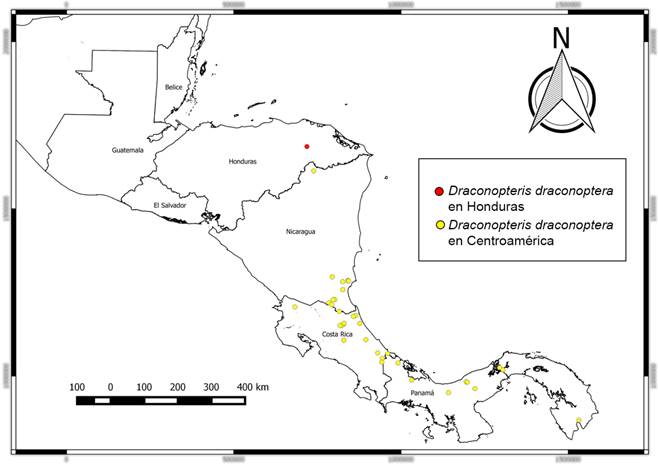 In 1996, the pteridophytes in Honduras were represented by 109 genera and 651 species. However, although there is no recent catalog that reflects the current diversity of this group, new records and species have been discovered in Honduran territory. In order to increase the knowledge of the previously mentioned group, the first record of Draconopteris draconoptera for the flora of Honduras is presented.