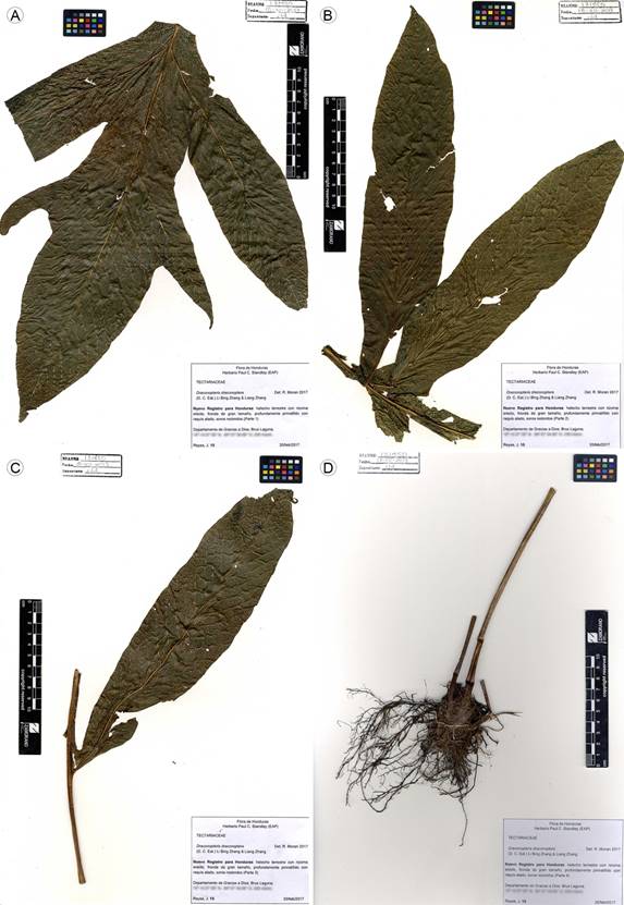 Figura 3: Draconopteris draconoptera. Ejemplar herborizado y almacenado en el herbario Paul C. Standley. J. Reyes 15 (EAP). A. ápice; B. pinnas mediales; C. pinna basal; D. rizoma.