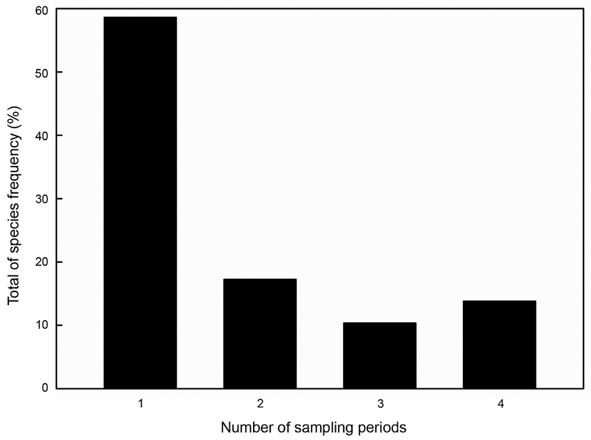 To analyze beta diversity, we determined the compositional similarity among sampling periods using the Jaccard index. This index has values ranging from 0 (minimal similarity) to 100 (maximum similarity) (Magurran, 2004). It only takes into account shared species and presence/absence of species between sites (Jost, 2006). The compositional similarity among sampling periods was represented by a cluster analysis using the Unweighted Pair Group Method with Arithmetic Mean (UPGMA) linkage technique. For the post hoc analysis, a similarity profile test (SIMPROF) was used as statistical test to compare similarity among assemblages in the PRIMER software version 6.1.16 (Clarke and Gorley, 2006). The SIMPROF test assumes that a real clustering of assemblages will be evidenced by an excess of smaller and/or larger similarities than expected under the null hypothesis that all assemblages are drawn from the same species assemblage (Clarke et al., 2008).
