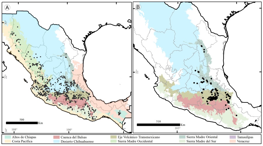 La riqueza por provincia biogeográfica se estimó empleando un cuadro de presencia-ausencia de las especies y el esquema de regionalización propuesto por Morrone et al. (2017). Éste propone la región Neártica, Neotropical, la Zona de Transición Mexicana y 14 provincias biogeográficas. La Zona de Transición Mexicana incluye las provincias biogeográficas de Altos de Chiapas, Eje Volcánico Transmexicano, Sierra Madre Occidental, Sierra Madre Oriental y Sierra Madre del Sur. A la región Neártica pertenecen Baja California, California, Sonora, Desierto Chihuahuense y Tamaulipas. La región Neotropical está compuesta por la Cuenca del Balsas, la Costa Pacífica, la Península de Yucatán y Veracruz.