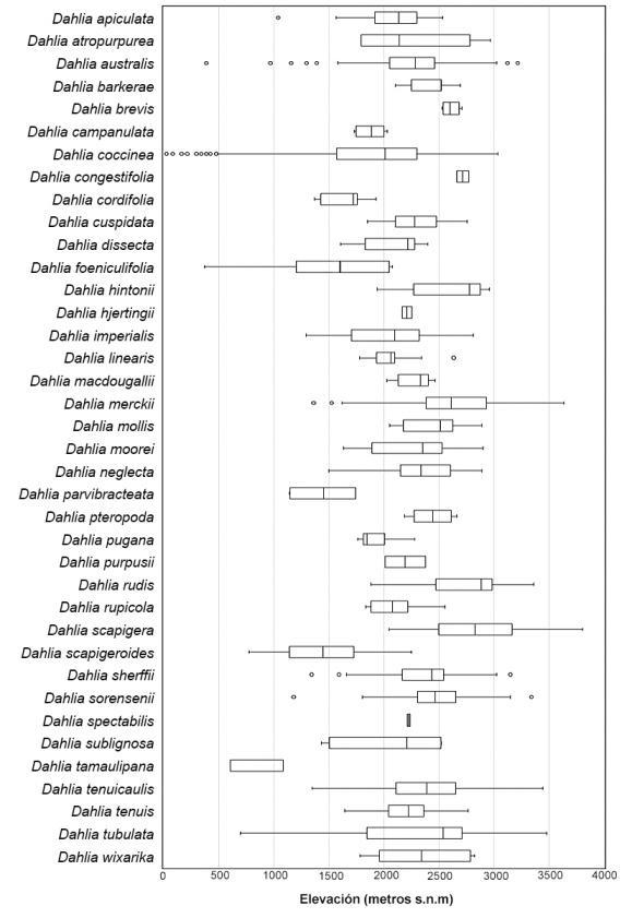 Dahlia crece de 24 a 4000 m de elevación (Fig. 4A), al igual que el mayor número de observaciones (837). Prospera en un gradiente de 15 a 29° de latitud norte (Fig. 4B) y longitudinalmente, en un rango que va de 92 a 108° W (Fig. 4C). Del total de especies, 33 se encontraron de 2001 a 2500 m (Fig. 4A), al igual que el mayor número de observaciones (837). Dahlia coccinea tiene el rango de elevación más amplio (24-3033 m). Caso contrario, D. congestifolia (2660-2769 m), D. hjertingii (2165-2252 m) y D. spectabilis (2213-2237 m) presentan la amplitud elevacional más restringida, mientras que D. scapigera Knowles & Westc. y D. merckii se encontraron por arriba de 3500 m (Fig. 5).