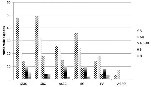 Tomando en cuenta las formas de vida en cada uno de los elementos, el grupo de los árboles es el mejor representado a escala del paisaje. Para las especies de SBC y SMS las especies arbóreas estuvieron representadas por 45 y 44% respectivamente. Esta tendencia se repitió para el BG donde se encontró que 45% de las especies correspondieron a esa forma de vida. También en el ASBC los árboles estuvieron ampliamente representados (34%); sin embargo, los arbustos son componentes importantes a nivel de especie (30%). Para la FV y AGRO la forma arbustiva fue la mejor representada (Fig. 2).