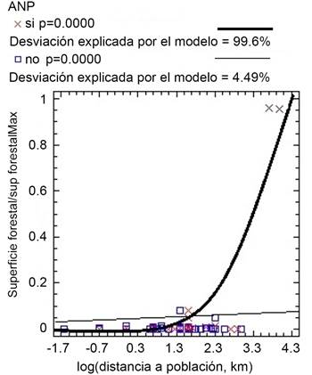 El deterioro o cambio de uso de suelo en el mosaico rural es un claro efecto de la presencia de asentamientos poblacionales. Lo anterior también se encuentra respaldado en el presente trabajo, al observarse que a medida que aumenta la distancia de la población más cercana, se incrementa el tamaño de todas las áreas naturales, tanto por separado (ANPs, ANnoPs) como en su conjunto (Fig. 6), indicando un claro efecto negativo de los asentamientos poblacionales sobre el cambio de uso de suelo en la proximidad de las áreas naturales.
