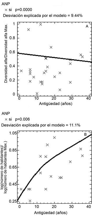 Mientras más antiguas son las ANPs de haber sido decretadas como reservas naturales, su diversidad arbórea disminuye y la densidad de su población más cercana aumenta (Figs. 7A, B). Para las demás variables de diversidad biológica, no se presentó ninguna relación significativa. Con base en el modelo de la relación diversidad α-antigüedad (α/αMax=exp(0.251091-0.0116193*antigüedad)/(1+exp (0.251091-0.0116193*antigüedad)) (Fig. 7A), la disminución de la diversidad transcurrida en 40 años equivale a 11.4% de las especies arbóreas.