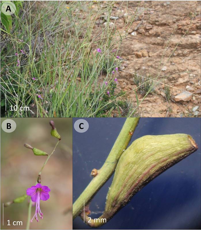 Figura 15: Mirabilis linearis (Pursh) Heimerl. A. vista general; B. flores; C. detalle de hojas y tallo con involucro maduro y antocarpo.