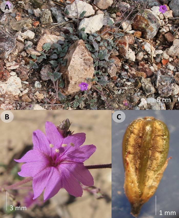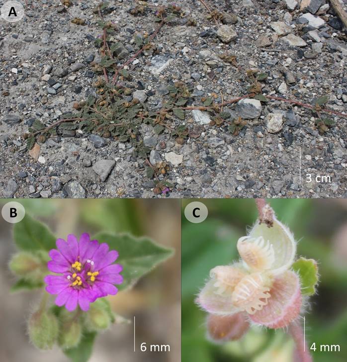 Figura 5: Boerhavia anisophylla Torr. A. vista general; B. flor; C. antocarpo con involucro persistente.