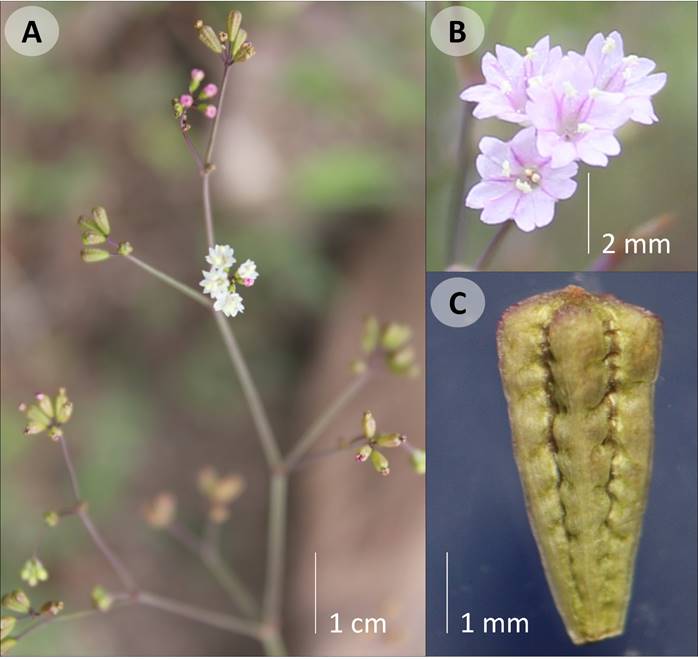 Figura 10: Cyphomeris gypsophiloides (M. Martens & Galeotti) Standl. A. vista general; B. inflorescencia; C. antocarpo.