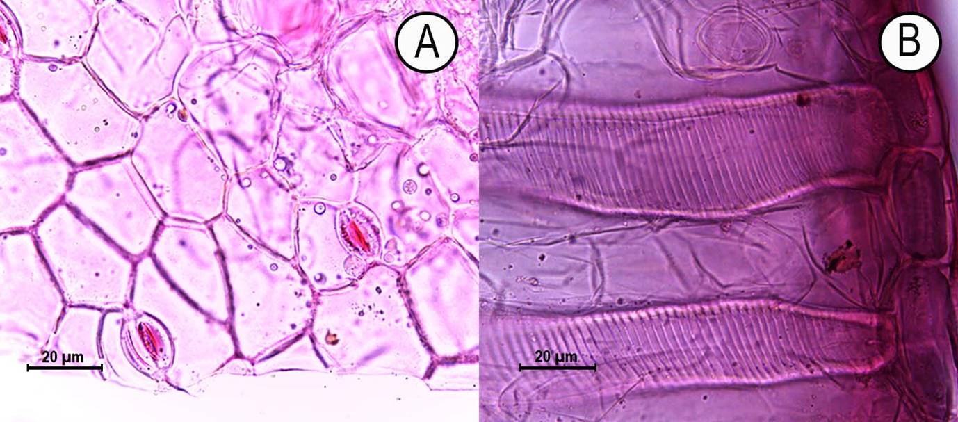 Figura 2: Corte transversal de tallo joven de Sarcocornia neei (Lag.) M.Á. Alonso & M.B. Crespo. A. epidermis con estomas del tipo paracítico; B. los vasos xilemáticos corticales llegando hasta la epidermis. 400×.