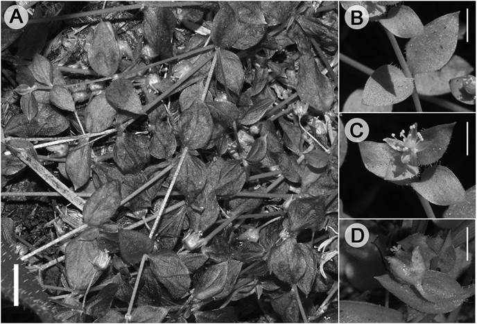 Figure 1: Engellaria obtusa (Engelm.) Iamonico from Western Cascades mountains Oregon, United States of America: A. habit (scale bar=1 cm); B. details of leaves (scale bar=5 mm); C. flower (scale bar=5 mm); D. fruit (scale bar=2.5 mm). Photos by T. Harvey.