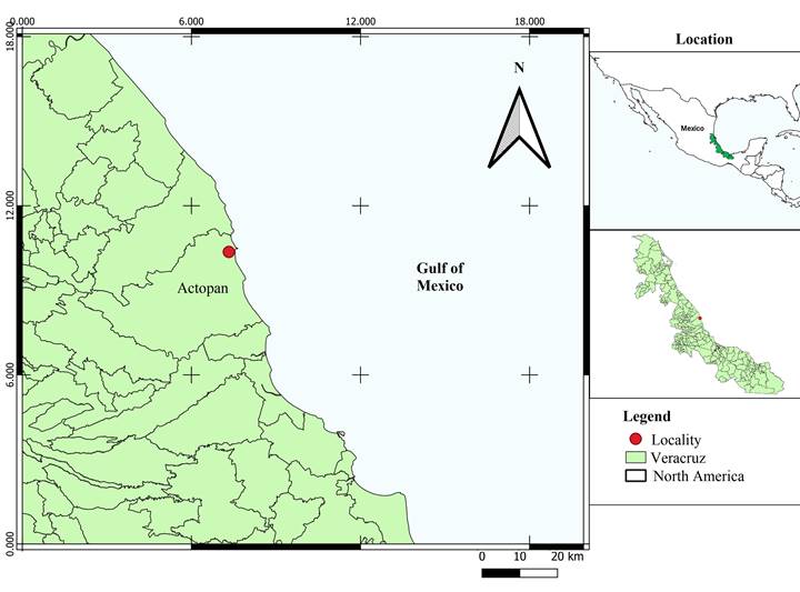 The material here studied was collected in vegetation related to tropical dry forest near the “Cerro de los Metates” (19°40'07.7''N, 96°24'51.7''W, 175 m a.s.l.) in Actopan, Veracruz, Mexico, in 2019 and 2020 (Fig. 1). Specimens were placed in paper bags and transported to the herbarium XALU of the Facultad de Biología of the Universidad Veracruzana, where they were sterilized by freezing. The specimens were analyzed by a stereomicroscope model Stemi Dv4 (Carl Zeiss, Jena, Germany) and microscopic structures were measured with a model Primo Star microscope (Carl Zeiss, Jena, Germany), in the Laboratory of Environmental Quality of the Facultad de Biología of the Universidad Veracruzana. The terminology and characteristics considered in this work follow the concepts of Egea and Torrente (1993). In addition to the macrochemical tests KOH 10% (K), NaClO (C), and KC (modification of K and C), and UV reaction, lichen substances were searched employing thin layer chromatography (TLC) in solvent C (Elix, 2014). Likewise, the presence of amyloid substances distributed in the thallus and ascoma was verified with Lugol’s solution (I), performing a pretreatment (IKI) of sections of the thallus and ascomas with potassium hydroxide (KOH 10%).