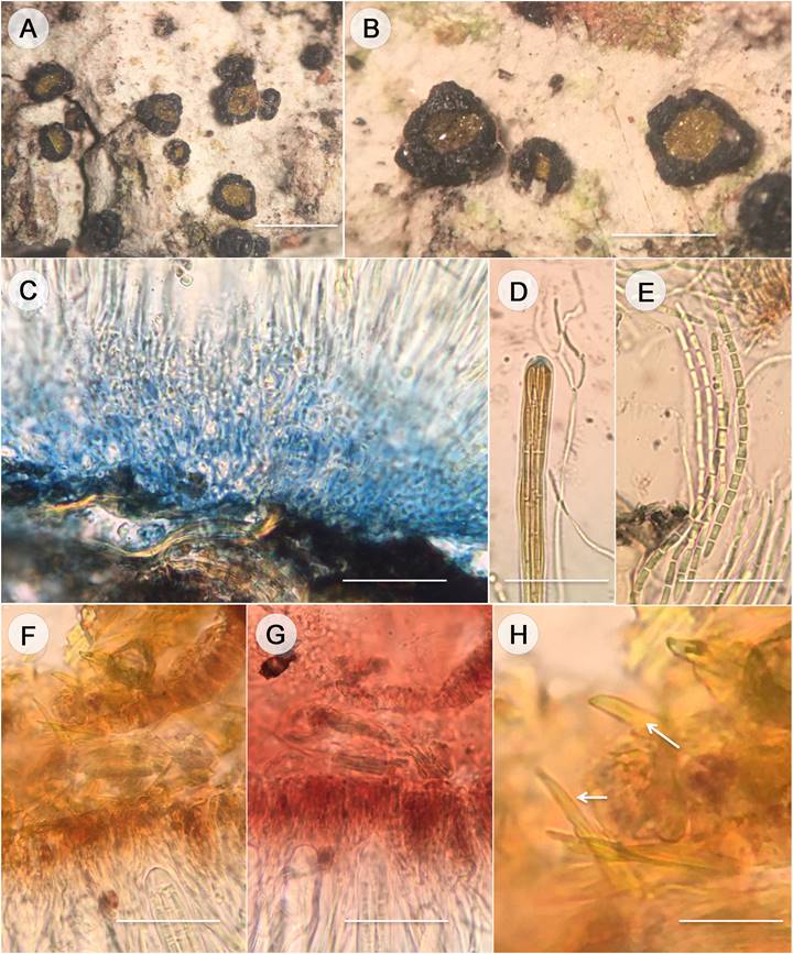 Figure 2: Holotype of Bactrospora totonacae Guzmán-Guillermo, Sorcia-Navarrete & Cárdenas-Mendoza. A-B. apothecia with yellow crystals (scale: A = 0.5 mm; B = 1 mm); C. subhymenium after KI (scale: 10 μm); D. asci and paraphysoids after KI (scale: 30 μm); E. ascospores (scale: 7.5 μm); F. yellow pseudoepithecium in water (scale: 20 μm); G. pseudoepithecium in K, the color change is visible (scale: 20 μm); H. yellow crystals found on the disc in water (arrows) (scale: 10 μm).