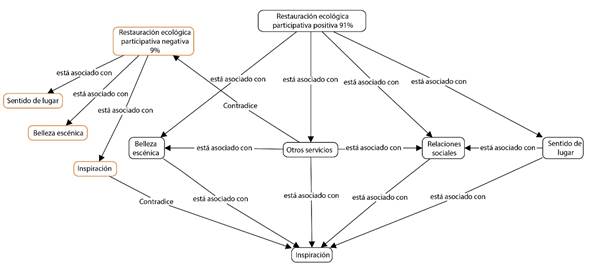 Los procesos de restauración ecológica participativa generan en la mayoría de los entrevistados (91%) una percepción positiva. El análisis de discurso permitió identificar la asociación entre la percepción positiva del proceso de restauración y los servicios de belleza escénica, relaciones sociales, sentido de lugar y “otros servicios”, y a su vez la asociación de estos servicios con el servicio de inspiración (Fig. 2). El 9% de los entrevistados registraron percepciones negativas hacia el proceso de restauración ecológica participativa. No se registraron asociaciones entre la percepción negativa del proceso y otros servicios, así como tampoco entre los servicios asociados a esta percepción negativa de procesos de restauración.