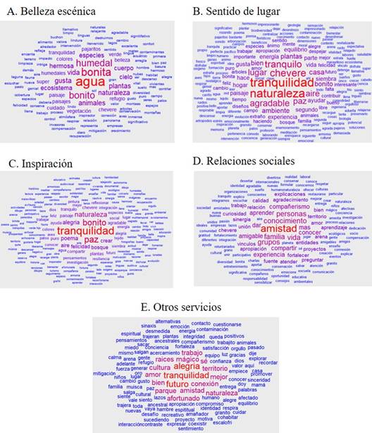 Los actores sociales entrevistados usan múltiples palabras para describir la percepción que tienen de los servicios ecosistémicos culturales de belleza escénica, sentido de lugar e inspiración. Para estos servicios, los actores sociales entrevistados mencionaron con alta frecuencia más de cinco palabras (Figs. 3A-C). Para el servicio de belleza escénica la palabra con la que más se asoció este servicio fue con “agua” (14 menciones). Para el servicio de sentido del lugar, las palabras “tranquilidad” y “naturaleza” fueron las más frecuentes (13 y 12 menciones respectivamente), mientras que “tranquilidad” y “paz” fueron las más frecuentes para el servicio de sentido de inspiración (18 y 13 menciones, respectivamente). Finalmente, el servicio de relaciones sociales solo fue descrito por 10 palabras clave, siendo “amistad” la palabra con mayor frecuencia de mención (ocho menciones; Fig. 3D). Además, palabras como “cultura” “territorio” y “raíces” fueron mencionadas para explicar “otros servicios” ecosistémicos, aunque con frecuencias reducidas (dos menciones para cada una; Fig. 3E).