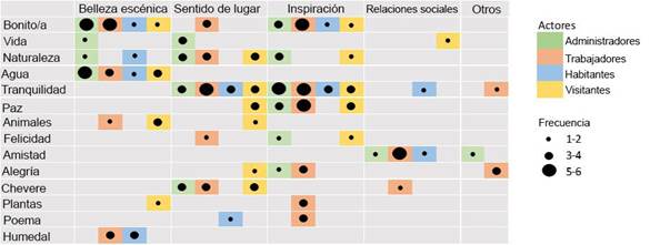 Se encontraron algunos patrones en la frecuencia de mención de palabras que describen la percepción de los entrevistados sobre los servicios ecosistémicos entre los administrativos, trabajadores, habitantes y visitantes (Fig. 4). Por ejemplo, la palabra “tranquilidad” fue enunciada por los cuatro grupos de actores para tres de los cuatro servicios analizados, y con mayor frecuencia por los trabajadores y los administradores. Lo mismo ocurrió con la palabra “bonito”, pero solo en tres de los servicios ecosistémicos analizados. Por su parte, la palabra “naturaleza”, también fue mencionada por todos los actores, para tres de los servicios analizados, pero en todos los casos la frecuencia de mención fue media. Las demás palabras fueron mencionadas por tres o menos grupos de actores, para tres o menos servicios ecosistémicos y con frecuencias medias a bajas.