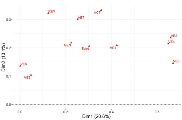 En el análisis de correspondencia múltiple (ACM), las primeras tres dimensiones representaron 45% de la varianza acumulada (Fig. 5). El análisis muestra que las variables que mejor representan las fotografías empleadas para valorar el servicio ecosistémico de valor educativo (VE) son: VE2 (proceso de crecimiento de semillas en germinadores, literal B, Apéndice 1), VE3 (explicación del cuidado de las plántulas antes del embolse, literal C, Apéndice 1), VE4 (siembra de plántulas en embolse después de su germinación, literal D, Apéndice 1), son las que están más correlacionadas con la dimensión uno. La variable que representa la fotografía VE7 (cubrimiento total de raíces de la planta con tierra abonada, literal G, Apéndice 1) es la que está más correlacionada con la dimensión dos (Fig. 5, Apéndice 2). Para la dimensión tres, la variable con mayor correlación fue “Actores”.