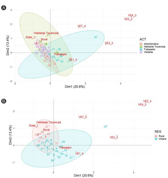 A partir de la Figura 5, las variables sociodemográficas que más contribución tuvieron en las primeras tres dimensiones del ACM fueron actores y residencia. De esta manera, se trazaron elipses de confianza para las categorías de estas dos variables con la finalidad de describir su asociación con las demás categorías. Se puede distinguir una separación parcial de las elipses de confianza del ACM relacionados con los valores otorgados al servicio ecosistémico valor educativo entre actores sociales (Fig. 6A) y entre habitantes rurales y urbanos (Fig. 6B). En la Figura 6 se puede distinguir que los valores que dieron los trabajadores se diferencian de los valores que dieron los demás actores. Por ejemplo, los trabajadores del Ecoparque dieron un valor de tres en la escala Likert (mayor contribución a la dimensión uno) a las fotografías B(=VE2), C(=VE3) y D(=VE4) del Apéndice 1, mientras que un valor de cuatro a la imagen G(=VE7) (mayor contribución a la dimensión dos, Fig. 6A). Tendencias similares se registraron entre habitantes urbanos y rurales (Fig. 6B).