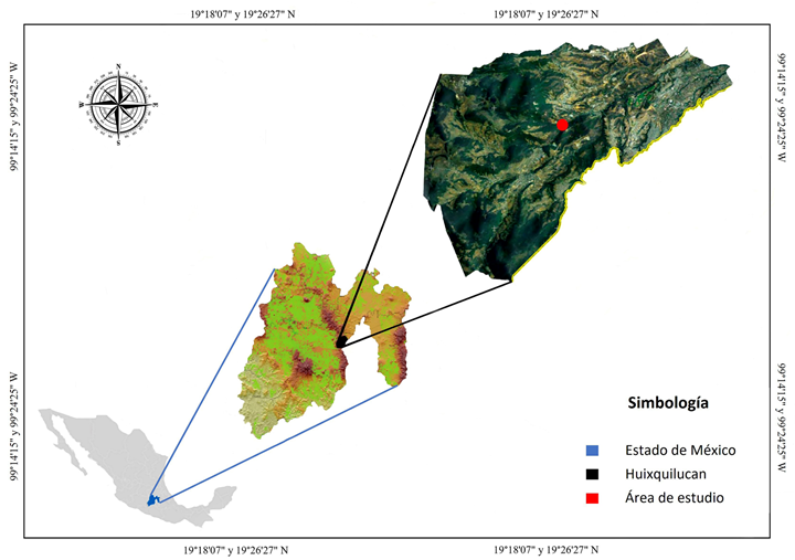 El área de recolección se localiza en el centro del Estado de México (Fig. 1), en el poblado San José Huiloteapan, municipio Huixquilucan (coordenadas 19°18'07'' - 19°26'27''N y 99°14'15''- 99°24'25''W) a 2680 m de altitud (GEM, 2017). Mientras que en todo el municipio los bosques de Quercus están ampliamente distribuidos y en ellos prosperan las especies Quercus candicans Née, Q. castanea Née, Q. crassipes Humb. & Bonpl., Q. deserticola Trel., Q. dysophylla Benth., Q. laurina Humb. & Bonpl., Q. mexicana Humb. & Bonpl. y Q. rugosa Née (Romero Rangel et al., 2002), en el área de estudio están presentes Quercus castanea, Q. crassipes, Q. deserticola, Q. laurina y Q. rugosa, sobresaliendo esta última por su abundancia.