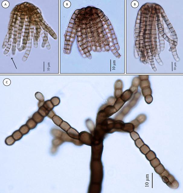Figura 2: Cryptocoryneum akitaense A. Hashim. & Kaz. Tanaka, A. conidio y conidióforo hialino (flecha); B. conidios. Dendryphion dichotomum Munjal & J.N. Kapoor, C. conidióforo con conidios.